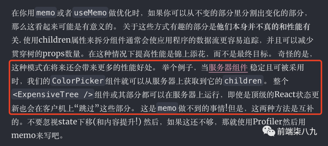 Dan的文章在使用React.memo之前的注意事项[1]中,通过几个例子来描述,有时候我们可以通过「组件组合」的方式来优化组件的多余渲染。文章中提到要么通过将「下放State」,要么将「内容提升」。因为组件组合是React的自然思维模式。正如Dan所指出的,这也将与Server Components非常契合。