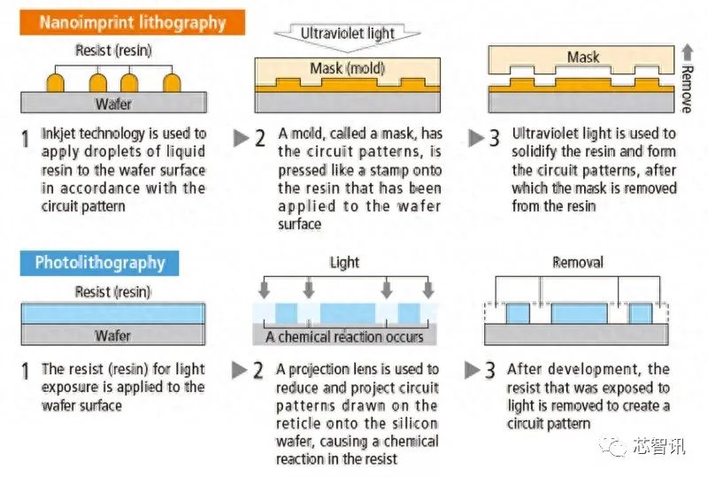 为此,从2017 年开始,半导体设备厂佳能就与存储芯片大厂铠侠,以及光罩等半导体零组件制造商大日本印刷株式会社(DNP)合作,在日本三重县四日市的铠侠工厂内研发基于纳米压印(NIL) 的量产技术,可以不使用EUV光刻机,就能使制程技术推进到5nm。