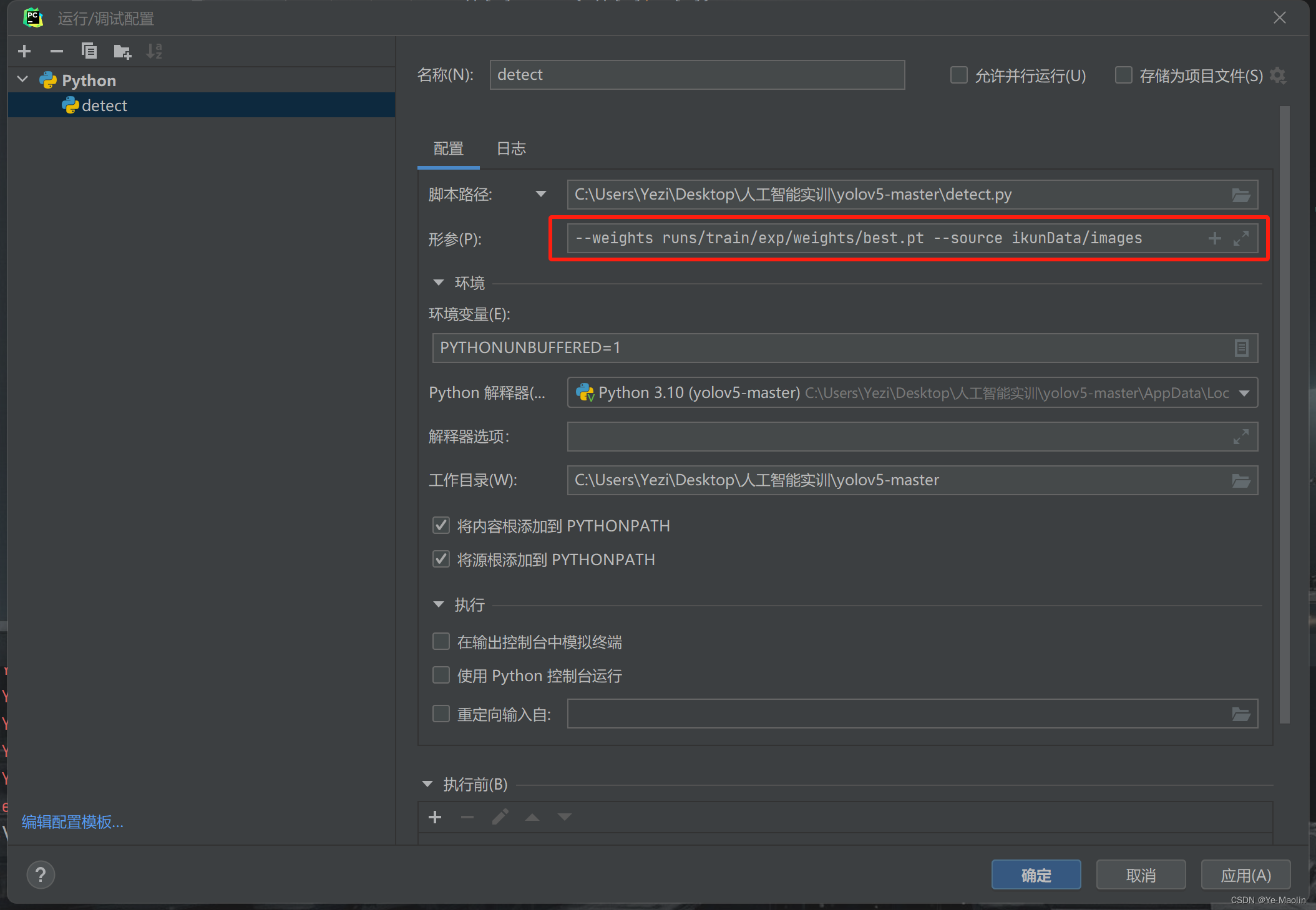 --weights runs/train/exp/weights/best.pt --source ikunData/images把它写到运行配置中去