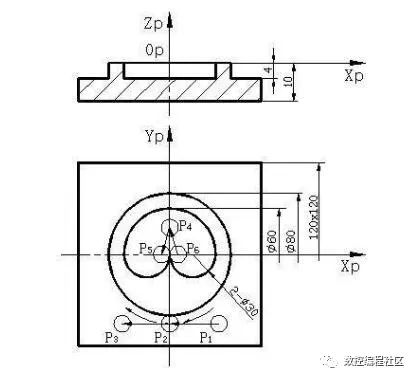 (7)内轮廓刀补的建立和取消。在铣削内轮廓的时候, 刀具移动受到限制,可先建立刀具半径补偿,然后下刀、取消刀具半径补偿时应先提刀再取消补偿。但须注意的是,在建立刀补时,控制系统要连续读入两段平面位移指令,才能计算出正确的刀具中心的偏置,即在建立刀补后的程序段中不能插入两个或两个以上没有XY 坐标移动的程序段, 否则会造成过切。