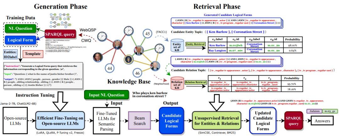 知识问答(KBQA)旨在通过检索大型知识库(KB)得出问题答案,该研究通常分为两个部分:知识检索和语义解析。但是目前KBQA仍然存在3个主要挑战:知识检索效率低下、检索错误影响语义解析结果以及先前KBQA方法的复杂性。在大型语言模型 (LLM) 时代,作者引入了「ChatKBQA,这是一种新型生成再检索KBQA 框架」,它建立在微调开源LLM的基础上,例如 Llama-2、ChatGLM2 和 Baichuan2。