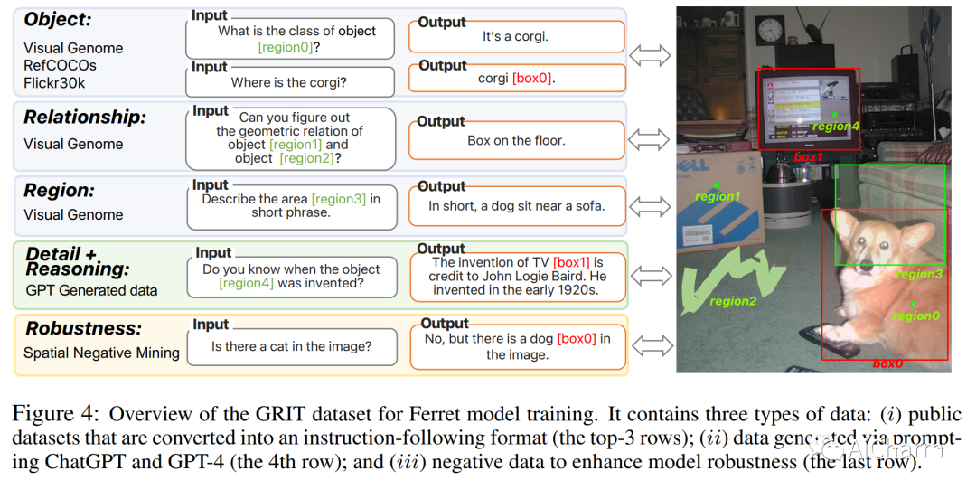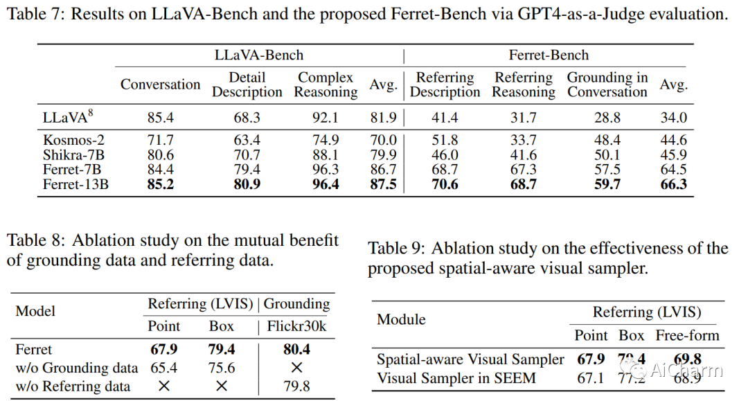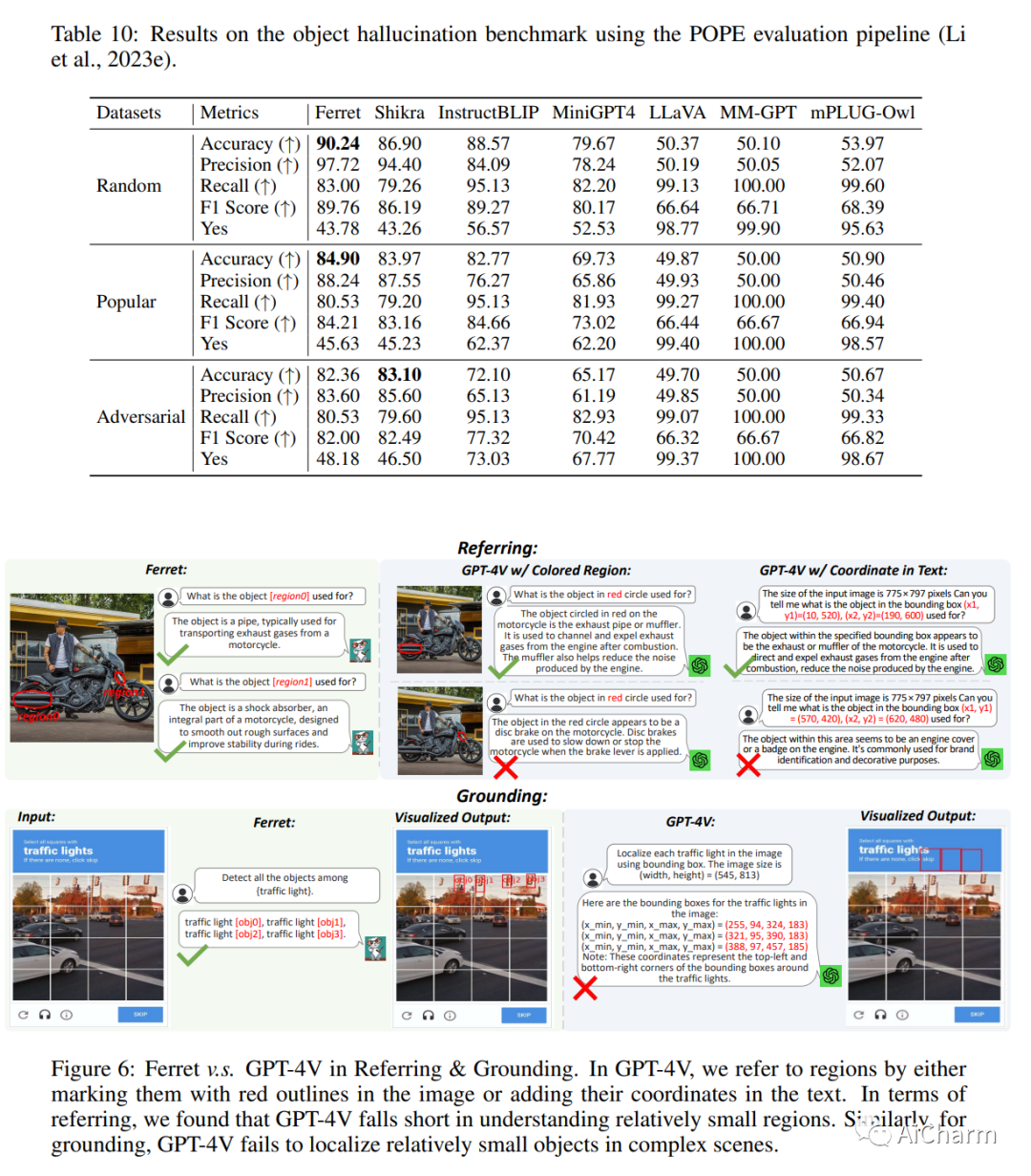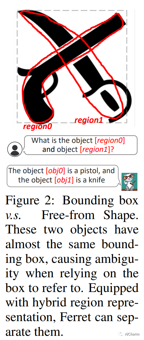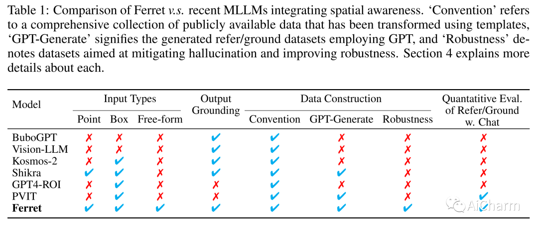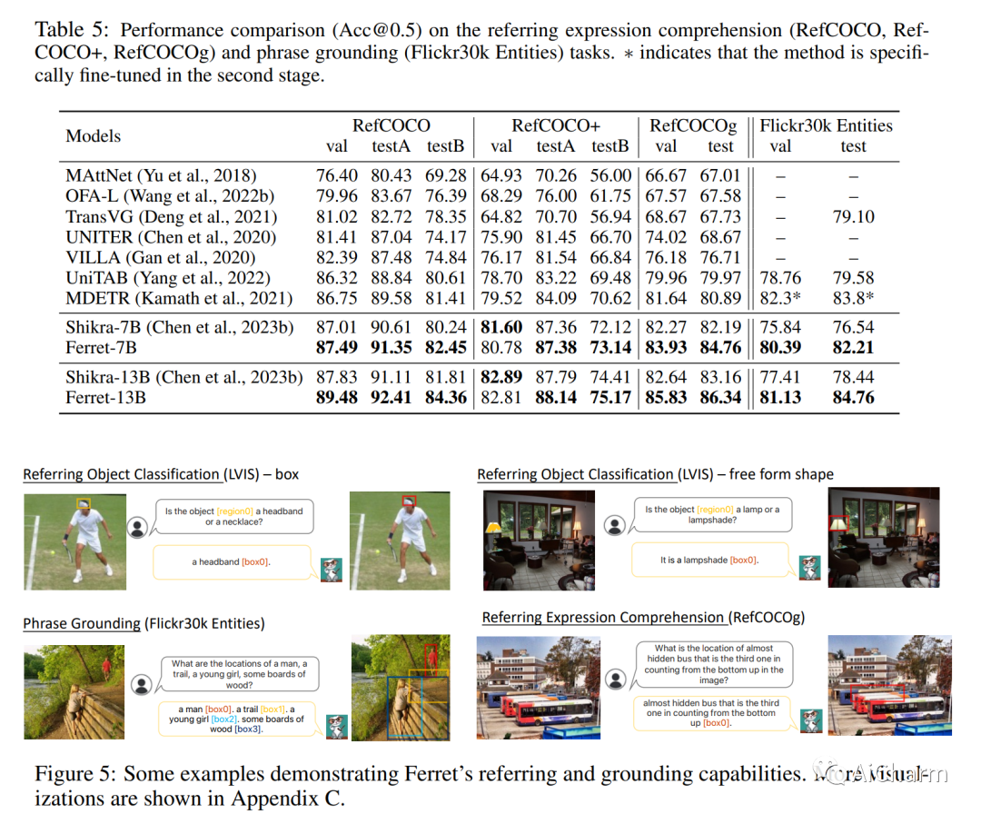 我们引入了 Ferret,一种新的多模态大语言模型 (MLLM),能够理解图像中任何形状或粒度的空间指代,并准确地建立开放词汇描述。为了统一 LLM 范式中的引用和基础,Ferret 采用了一种新颖且强大的混合区域表示,将离散坐标和连续特征联合集成来表示图像中的区域。为了提取多功能区域的连续特征,我们提出了一种空间感知视觉采样器,擅长处理不同形状的不同稀疏性。因此,Ferret 可以接受不同的区域输入,例如点、边界框和自由形状。为了增强 Ferret 的所需功能,我们策划了 GRIT,这是一个全面的参考和基础指令调整数据集,其中包括 110 万个样本,其中包含丰富的分层空间知识,并具有 95K 硬负数据以提高模型的鲁棒性。由此产生的模型不仅在经典的参考和基础任务中实现了卓越的性能,而且在基于区域和本地化需求的多模态聊天中也大大优于现有的 MLLM。我们的评估还表明,描述图像细节的能力显着提高,物体幻觉也显着减轻。
