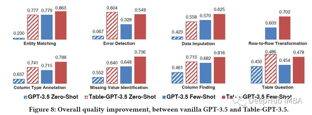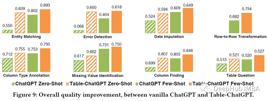 8种任务类型的结果,绿色条形图是ChatGPT,橙色条形图是表调优版本。通过表调优,可以清楚地看到大多数任务的改进。值得注意的是错误检测,其中表调优版本的零样本性能得到了显着提高。底部的4个图表是表调优模型没有训练的任务,但它仍然能够在ChatGPT之上提高性能。