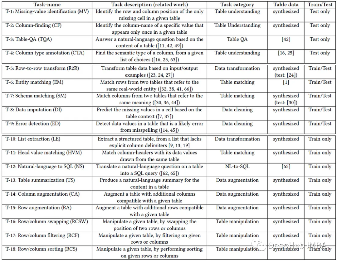 研究人员还为其他各种任务合成了数据,比如错误检测,其中一个错别字被自动注入到随机单元格中,原始单元格的值被用作标签。另一种是表摘要,其中使用维基百科表的标题作为标签。我们可以从论文的下表中看到不同任务的总结。