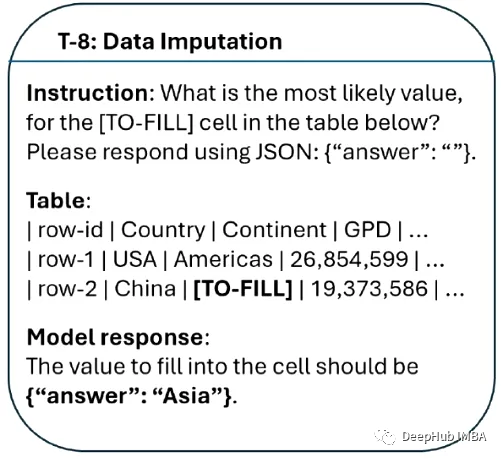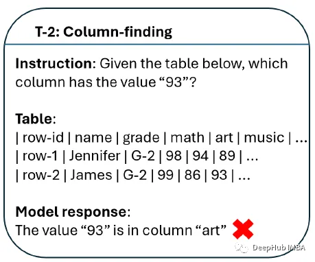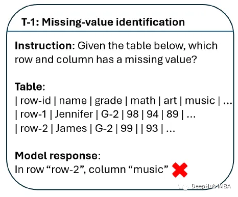 在上述示例中,我们可以看到用于查找表中缺少值的行和列的指令。第2行中“art”列的值缺失,但是经过测试的语言模型能够得到行,但列是错误的。这样的例子意味着模型更擅长水平推理而不是垂直推理。实际上,当在1000个样本上评估ChatGPT时,ChatGPT提供了92.3%的正确行号和42.2%的正确列。研究人员将这项任务称为“missing-value identification”。