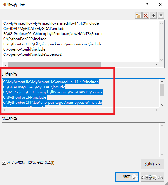 此外,我们可以在原有项目的附加包含目录、附加库目录中,通过复制“计算的值”窗口中的内容,实现跨行批量复制,如下图所示。