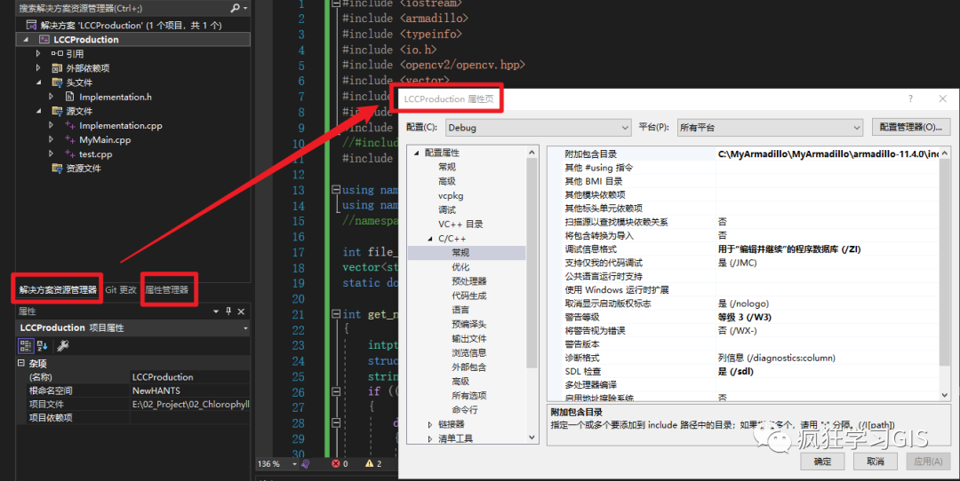 例如,我们现有一个解决方案,其中的一个项目需要调用Armadillo、OpenCV等多个不同的C++第三方库;我们也已经在这一项目中配置好了所需的各个第三方库,如下图所示。