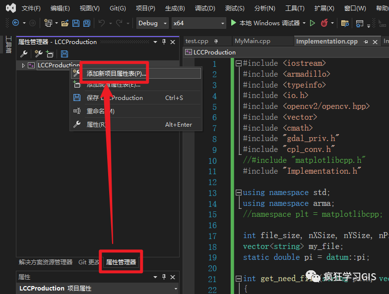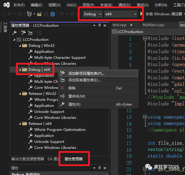 随后,在“解决方案资源管理器”附近,找到“属性管理器”,并双击项目名称将其展开;随后,基于我们代码需要运行的环境属性(比如Release还是Debug,Win32还是x64),将对应的属性信息展开,并右键选择“添加新项目属性表…”。如下图所示,我这里因为希望在Debug版本的x64环境下运行代码,因此就选择在这一环境属性信息对应处右键。