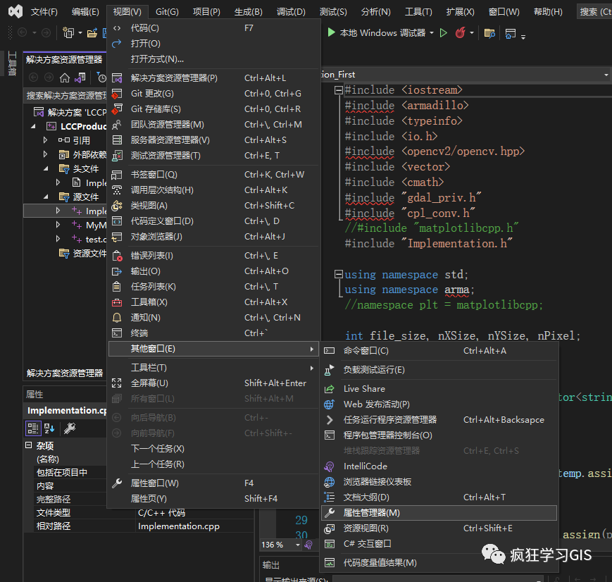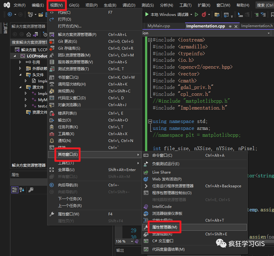 首先,我们需要在原有的项目(也就是已经配置好各类第三方库的项目)中,选择“视图”→“其他窗口”→“属性管理器”选项,如下图所示。