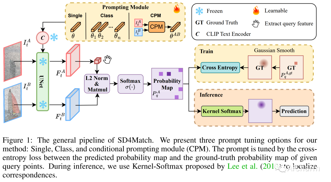 在本文中,我们解决了跨图像对匹配语义相似的关键点的挑战。现有研究表明,稳定扩散(SD)内 UNet 的中间输出可以作为此类匹配任务的鲁棒图像特征图。我们证明,通过采用基本的即时调整技术,可以利用稳定扩散的固有潜力,从而比以前的方法显着提高准确性。我们进一步引入了一种新颖的条件提示模块,该模块根据输入图像对的局部细节进行提示,从而进一步提高性能。我们将我们的方法指定为 SD4Match,是语义匹配稳定扩散的缩写。SD4Match 对 PF-Pascal、PF-Willow 和 SPair-71k 数据集的综合评估表明,它为所有这些数据集的准确性树立了新的基准。特别是,SD4Match 在具有挑战性的 SPair-71k 数据集上比之前最先进的技术高出 12 个百分点。