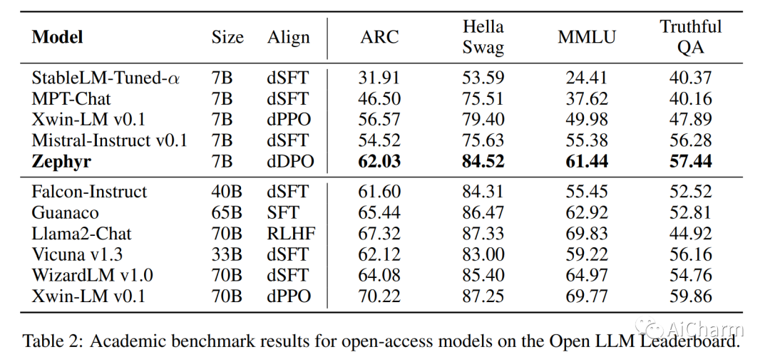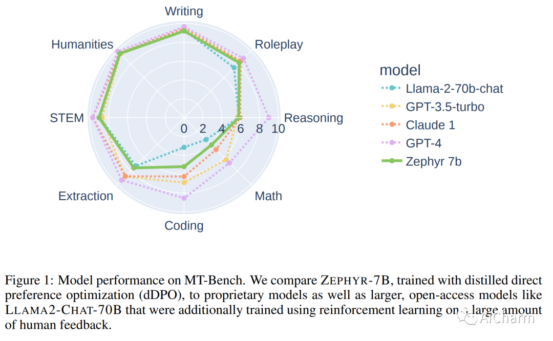 我们的目标是产生一个更小的、符合用户意图的语言模型。先前的研究表明,在较大的模型上应用蒸馏监督微调(dSFT)可以显着提高任务准确性;然而,这些模型并不一致,即它们不能很好地响应自然提示。为了提炼这个属性,我们尝试使用来自人工智能反馈(AIF)的偏好数据。从按教师模型排序的输出数据集开始,我们应用蒸馏直接偏好优化(dDPO)来学习意图一致性显着改善的聊天模型。该方法只需要几个小时的训练,在微调过程中不需要任何额外的采样。最终结果 Zephyr-7B 为 7B 参数模型设定了最先进的聊天基准,并且不需要人工注释。特别是,MT-Bench 上的结果表明 Zephyr-7B 超越了基于 RLHF 的最佳开放访问模型 Llama2-Chat-70B。该系统的代码、模型、数据和教程可从此 https URL 获取。