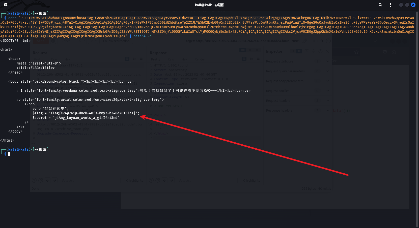 echo "PCFET0NUWVBFIGh0bWw+Cgo8aHRtbD4KCiAgICA8aGVhZD4KICAgICAgICA8bWV0YSBjaGFyc2V0PSJ1dGYtOCI+CiAgICAgICAgPHRpdGxlPkZMQUc8L3RpdGxlPgogICAgPC9oZWFkPgoKICAgIDxib2R5IHN0eWxlPSJiYWNrZ3JvdW5kLWNvbG9yOmJsYWNrOyI+PGJyPjxicj48YnI+PGJyPjxicj48YnI+CiAgICAgICAgCiAgICAgICAgPGgxIHN0eWxlPSJmb250LWZhbWlseTp2ZXJkYW5hO2NvbG9yOnJlZDt0ZXh0LWFsaWduOmNlbnRlcjsiPuWViuWTiO+8geS9oOaJvuWIsOaIkeS6hu+8geWPr+aYr+S9oOeci+S4jeWIsOaIkVFBUX5+fjwvaDE+PGJyPjxicj48YnI+CiAgICAgICAgCiAgICAgICAgPHAgc3R5bGU9ImZvbnQtZmFtaWx5OmFyaWFsO2NvbG9yOnJlZDtmb250LXNpemU6MjBweDt0ZXh0LWFsaWduOmNlbnRlcjsiPgogICAgICAgICAgICA8P3BocAogICAgICAgICAgICAgICAgZWNobyAi5oiR5bCx5Zyo6L+Z6YeMIjsKICAgICAgICAgICAgICAgICRmbGFnID0gJ2ZsYWd7ZTI0OTJhMTktZDhjYi00OGYzLWIwOTctYjM0OGQyNjEwZmExfSc7CiAgICAgICAgICAgICAgICAkc2VjcmV0ID0gJ2ppQW5nX0x1eXVhbl93NG50c19hX2cxcklmcmkzbmQnCiAgICAgICAgICAgID8+CiAgICAgICAgPC9wPgogICAgPC9ib2R5PgoKPC9odG1sPgo=" | base64 -d