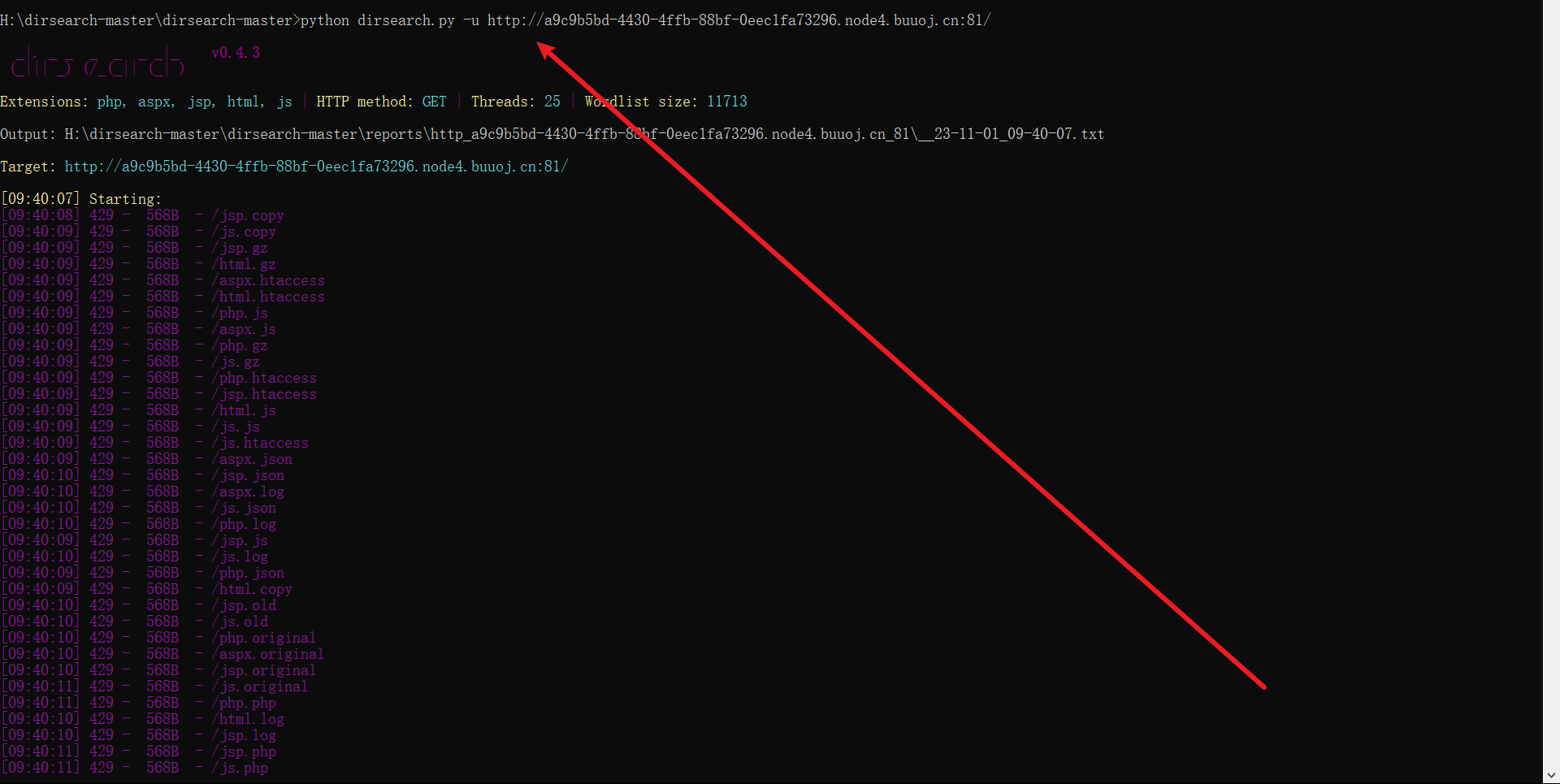 python dirsearch.py -u [http://a9c9b5bd-4430-4ffb-88bf-0eec1fa73296.node4.buuoj.cn:81/](http://a9c9b5bd-4430-4ffb-88bf-0eec1fa73296.node4.buuoj.cn:81/)