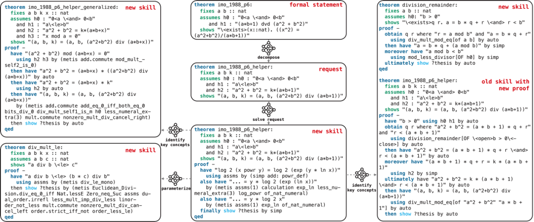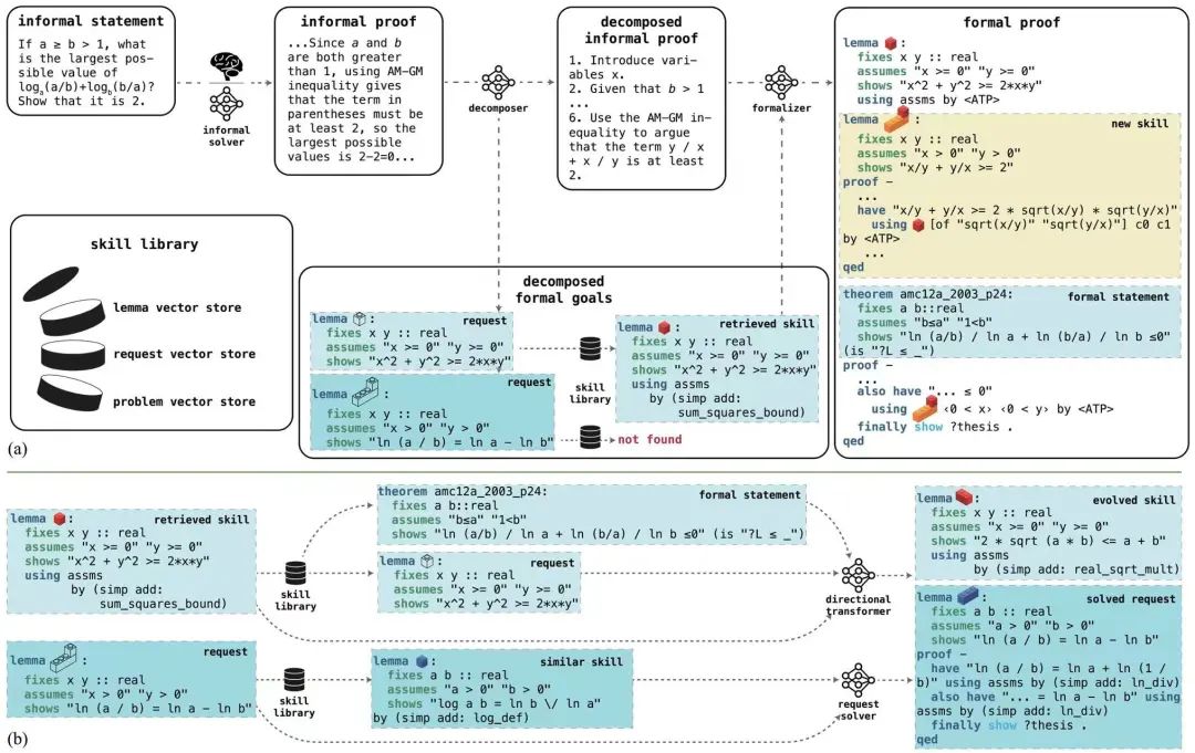 然而,与数学文字问题一样,当前进行定理证明的方法通常是 “一次性的”,也即推理过程和中间结论仅仅作为通向最终证明的临时性路径,在完成证明的验证后即被丢弃、并不对后续的定理证明产生贡献。这种方式更像是对大语言模型进行静态测试,而没有对其能力的持续提升做出贡献。