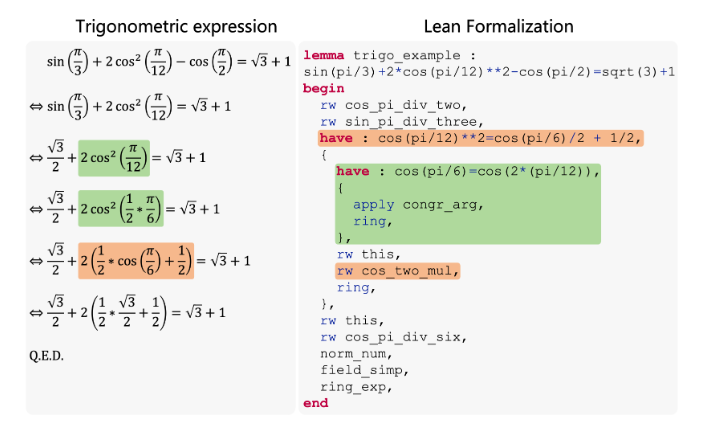 TRIGO 对自动引理生成以及如何从合成的引理数据的分布泛化到真实世界数据的分布进行了进一步的探索。当前的自动定理证明数据集主要侧重于符号推理,很少涉及复杂数字组合推理的理解。TRIGO 不仅要求模型通过逐步证明来简化三角函数表达式,还评估了生成式语言模型在公式和数字术语的操作、分组和因式分解方面的推理能力。研究团队从网络上收集了三角函数表达式及其简化形式,人工标注了简化过程,然后将其转化为 LEAN 形式系统下的语言。在有一定的来自于真实世界的形式化定理数据后,研究团队利用引理生成器,从已标注的样本中初始化 Lean-gym 来自动生成新的引理以扩展数据集。