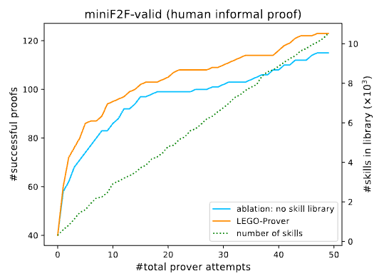 实验表明,这些演化得到的新定理在后续的定理证明中起到了关键性的作用,miniF2F 数据集中的许多定理都是在利用这些从定理库中抽取得到的结果才得以证明的。使用收集和演化得到的定理库后,LEGO-Prover 的证明成功率从 47.1% 提高到 50.4%,而在使用定理库的情形下,有 24% 的问题是在技能库的帮助下完成的,这表明技能库的使用对于大语言模型进行定理证明任务而言帮助很大。此外,使用定理库技术的优势在较小的尝试次数下具有较高的比例,表明这一方法对于计算资源相当有限的情形下具有相当可观的使用价值。