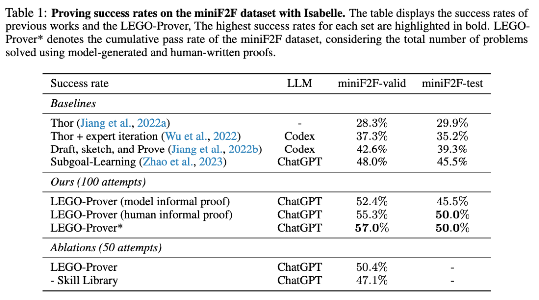 最后,实验结果表明 LEGO-Prover 在 miniF2F 数据集上的证明成功率显著优于基于先前的方法。使用人类编写的证明,LEGO-Prover 在验证集和测试集上的证明成功率分别比先前最好的方法高出 19% 和 3.5%。当使用模型生成的非正式证明替代人类编写的非正式证明时,LEGO-Prover 在验证集上的证明成功率仍然达到了 52.4%,接近于使用人类编写的非正式证明的证明成功率 55.3%。