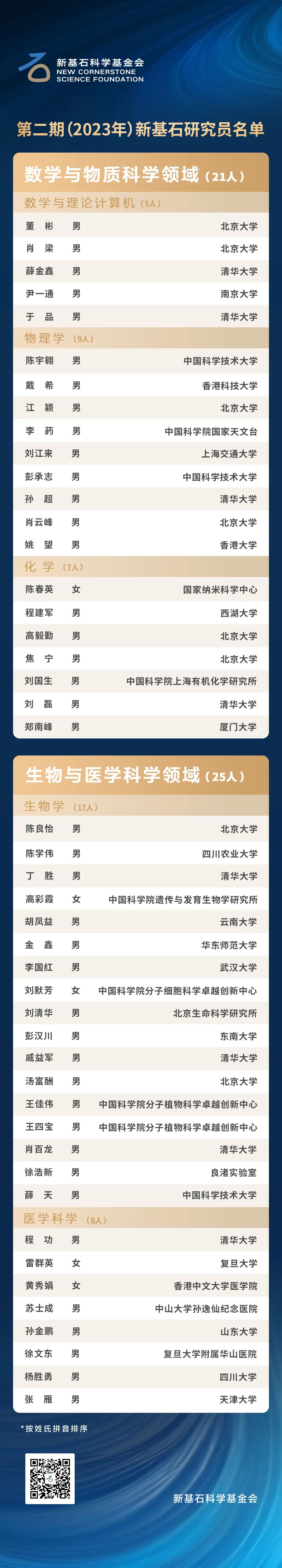 坚持“宁缺毋滥”的原则,第二期“新基石研究员”计划资助不超过50人,实际入选46名。