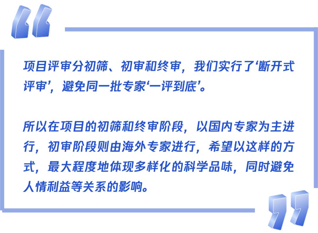 项目邀请了近千位具有国际视野、在国内外经历过大型科学项目评审的一流科学家参与多轮评审,并且,在今年初审阶段进行了100%的海外同行评审。此外,项目还执行了严格的回避制度,对不当行为采取“零容忍”的态度。