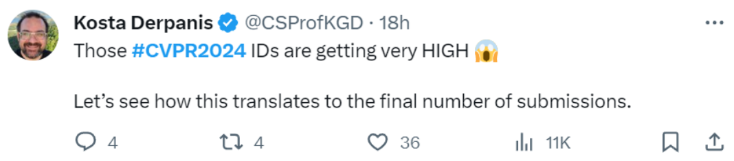 Kosta Derpanis 教授(CVPR 2024 Publicity Co-chair)透露这次CVPR 2024 投稿ID 非常非常高!将突破去年的纪录,达到一个新的高度!