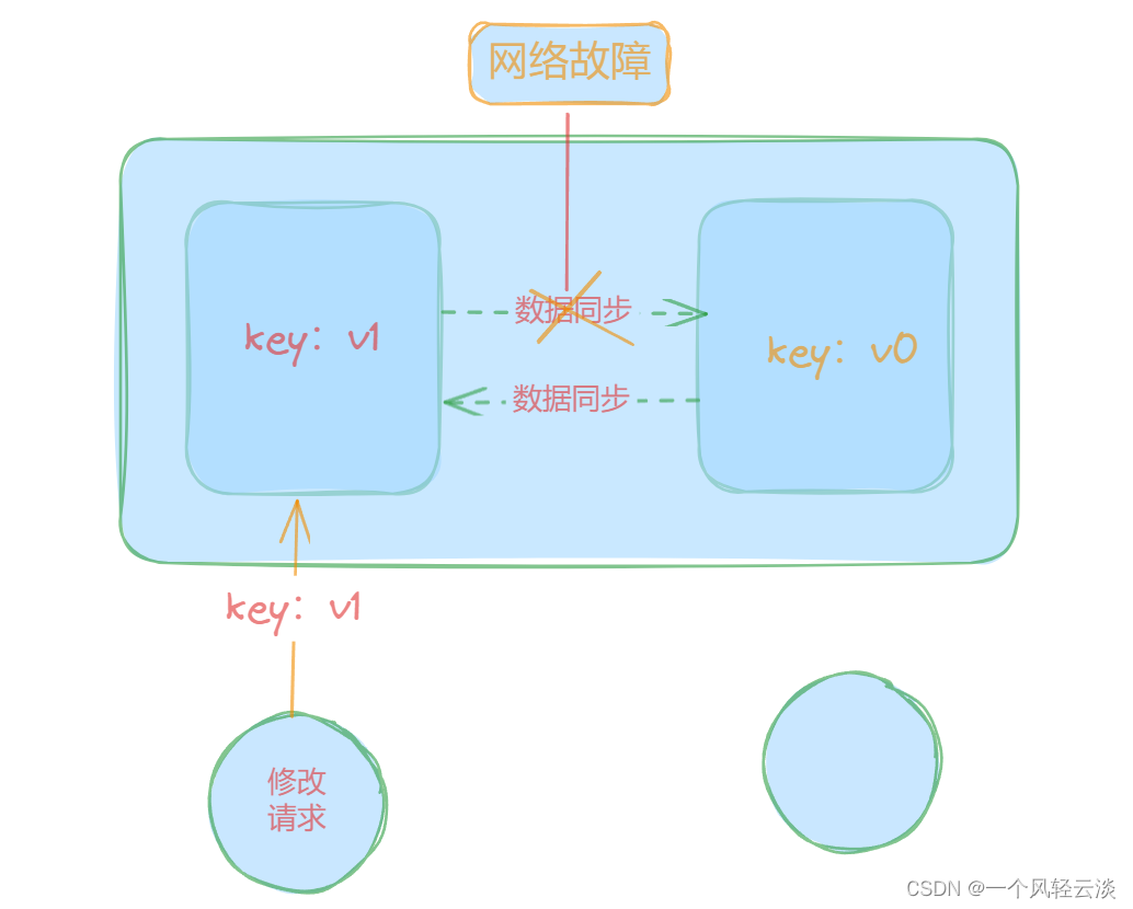 按照道理,第一台服务器会向第二台服务器进行数据同步,但是现在假设一种极端情况,第一台服务器跟第二台服务器之间的网络断开了,但我们仍要支持这种网络异常,也就是满足分区容错性,