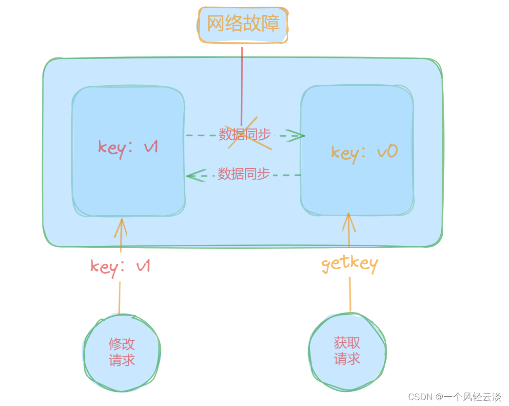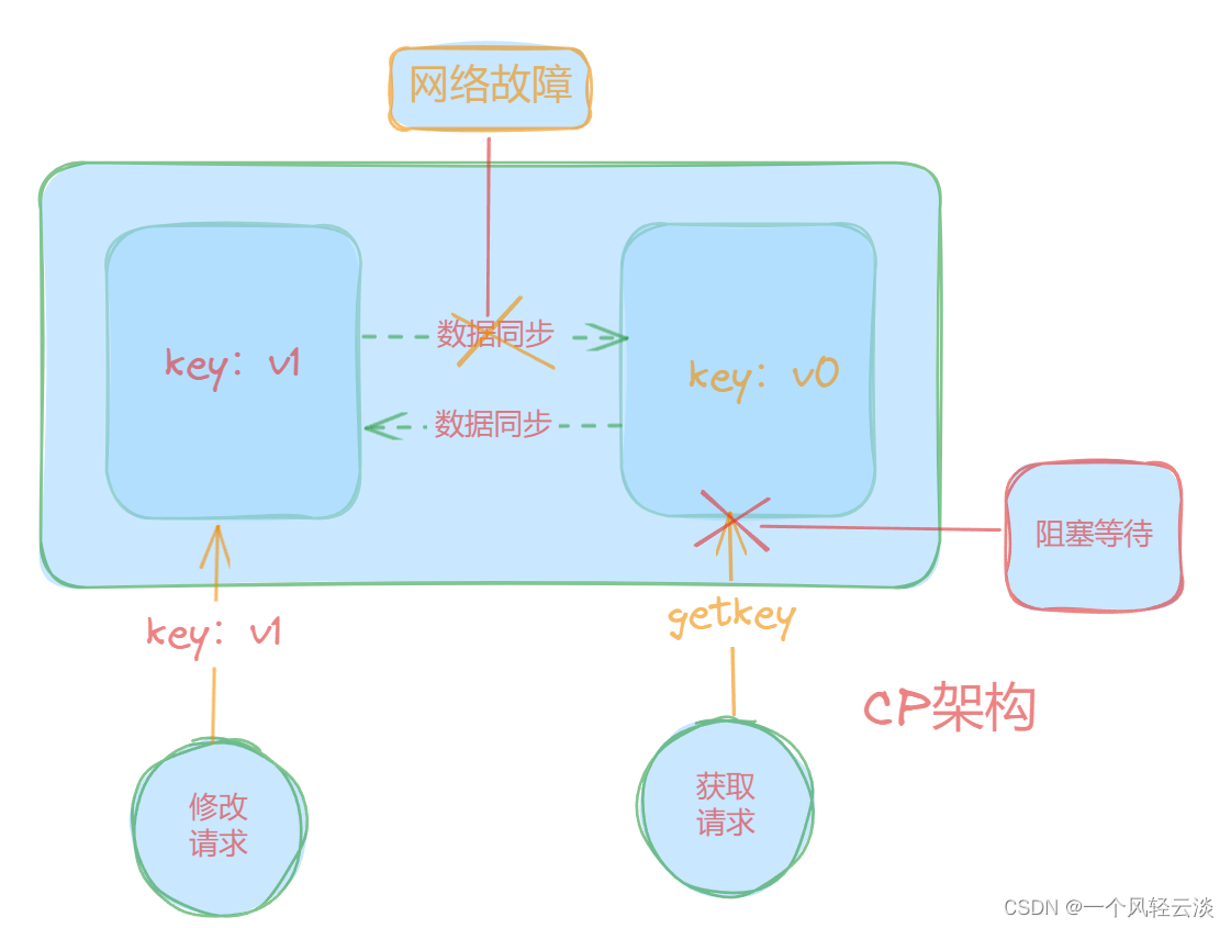 由于数据还没有进行同步,应用程序没办法立即给用户返回最新的数据 V1,怎么办呢?有二种选择,第一,牺牲数据一致性,响应旧的数据V0给用户;第二,牺牲可用性,阻塞等待,直到网络连接恢复,数据更新操作完成之后,再给用户响应最新的数据V1。