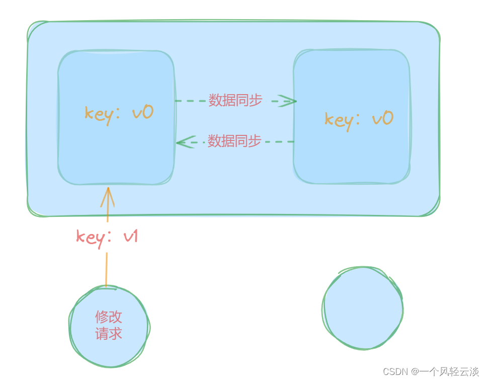 现在一个修改请求到达第一条服务器,将key修改为v1。