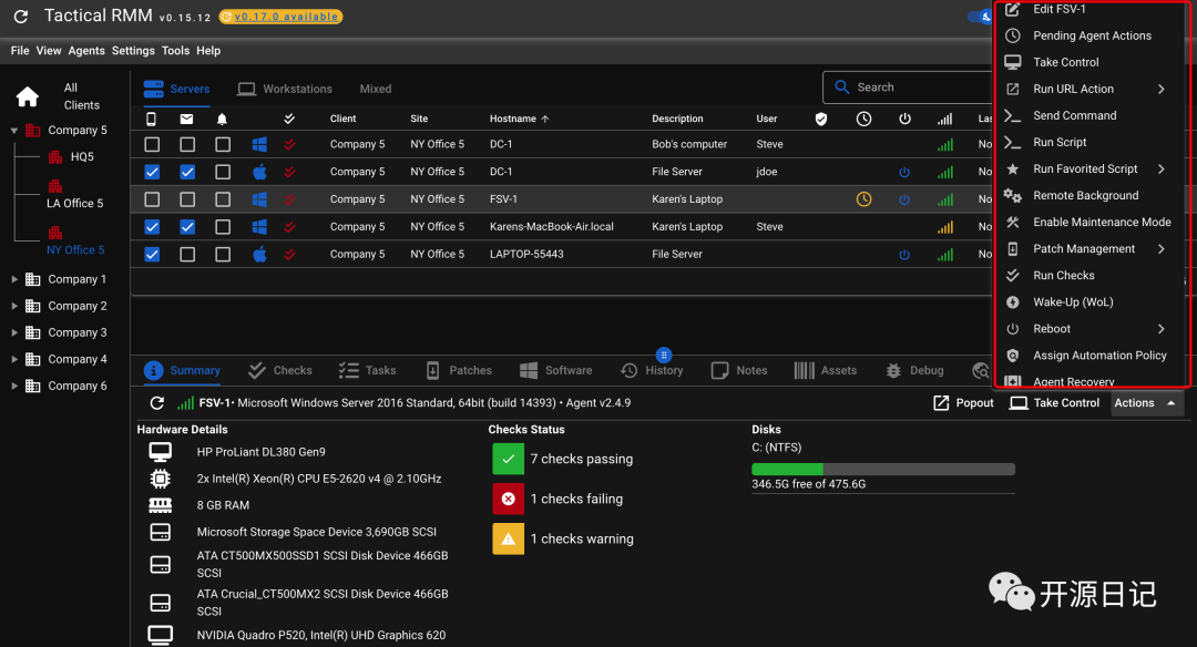 tacticalrmm 由 Amidaware 开发。该软件的主要特点是简单易用、功能丰富,适合于管理员和有需要远程管理计算机的用户使用。该软件可以在 Windows 上运行,支持 Windows XP 及以上版本。