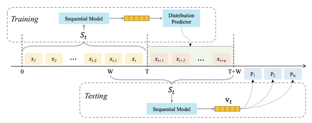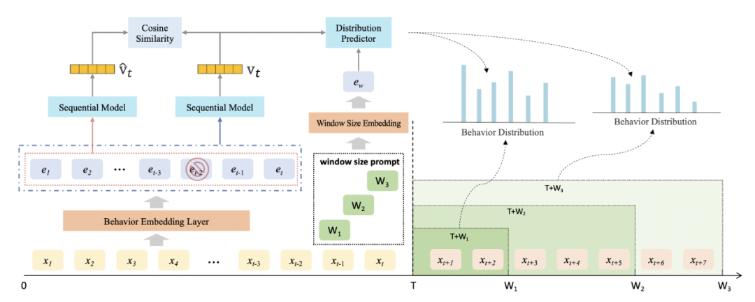 ,我们通过用户发生在时间窗口 (T, T+W] 内的行为作为自监督信号。如前文所述,用户的行为由于随机性与噪声的原因,准确预测未来 (T, T+W] 的特定行为是比较困难的,但由于用户行为在时间上具有一致性,整体的行为分布是可预测的。