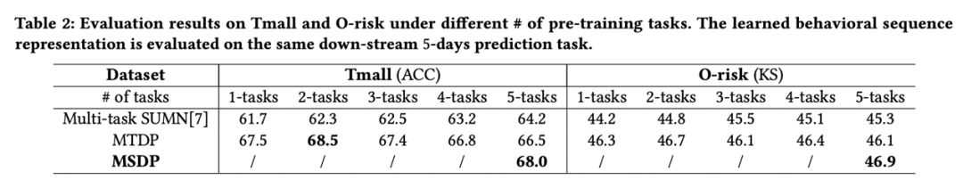 1)DP vs. MBP 与 NBP:DP 类的预训练方法(包括 static-DP,MTDP,MSDP)都显著优于 MBP 类方法(如 BERT4Rec)或 MBP 与 NBP 结合的方法(如 PTUM),以及当前 SOTA 的用户行为预训练方案(如 UserBERT)。从结果表明 MBP 与 NBP 类的方法由于用户行为中的随机性等问题,不太适合用于构建稳定的用户行为表征,而 DP 类的方法对学习鲁棒稳定的用户行为表征更有帮助的。