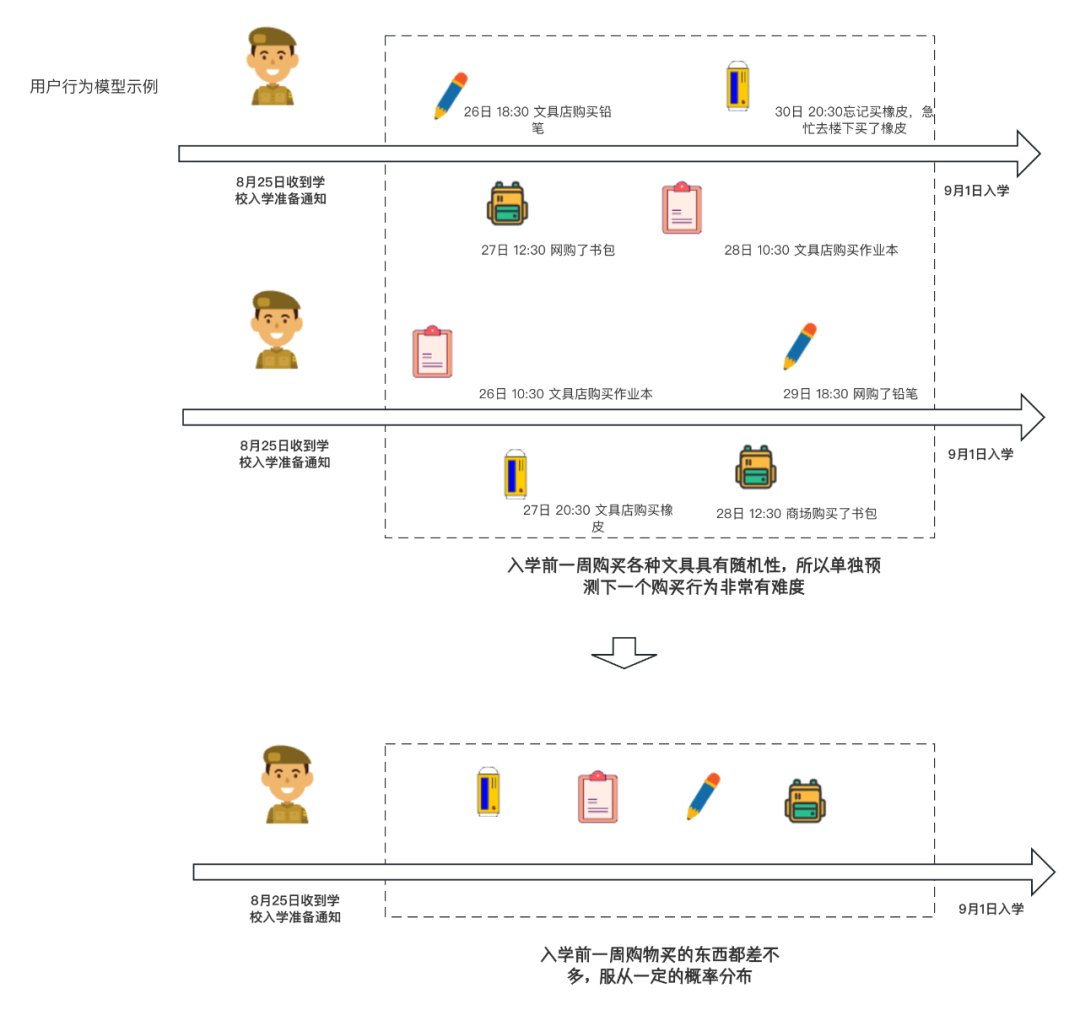 在无数种行为的可能性中,虽然用户的下一个具体行为难以琢磨,但若我们预测用户在一段时间内是否会发生某一个 (种) 行为往往具备更大的可能性。即虽然单个行为无法预测,但用户的行为分布在一段时间内相对稳定,这也符合人类行为具备一致性这一朴素常识。