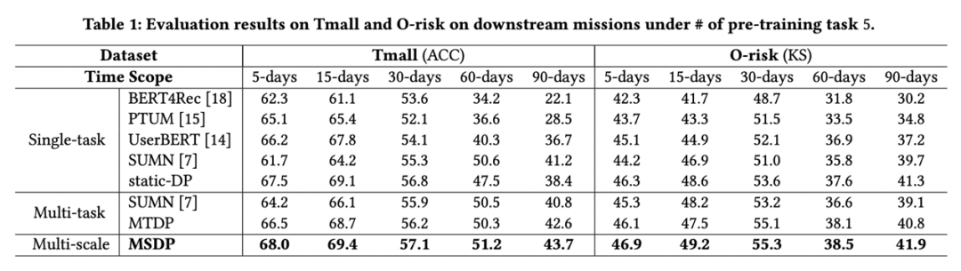 2)天猫数据集:用户行为序列数据包含用户在天猫的点击、收藏、购买的商品,下游任务设定为预测用户未来若干天内最感兴趣的商品类别(使用点击次数最多的商品作为最感兴趣的),具体来说,分别预测用户在未来 5 天,15 天,30 天,60 天,90 天最感兴趣的商品类别。