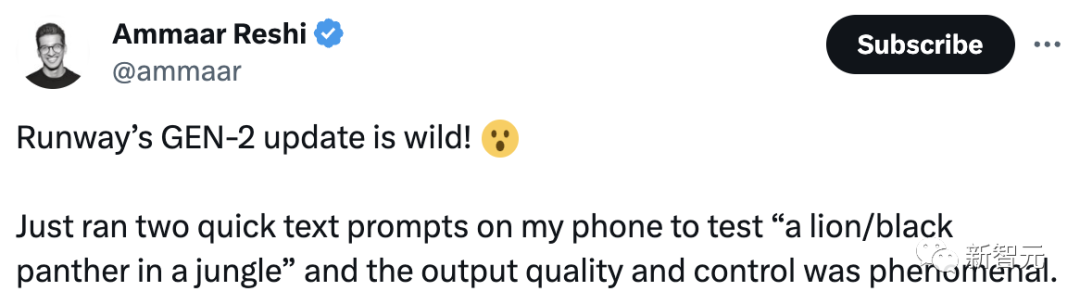 这位网友表示,Runway的Gen-2更新太疯狂了! 我刚刚在手机上快速运行了2个文本提示,测试了「丛林中的狮子/黑豹」,输出质量和控制都非常出色。