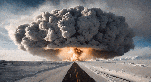 Prompt:Cinematic wide-angle shot. An atomic explosion erupts in the icy landscape, engulfing the surroundings in a blinding light. Devastating and surreal, a cataclysmic display of power. Directed by Christopher Nolan.