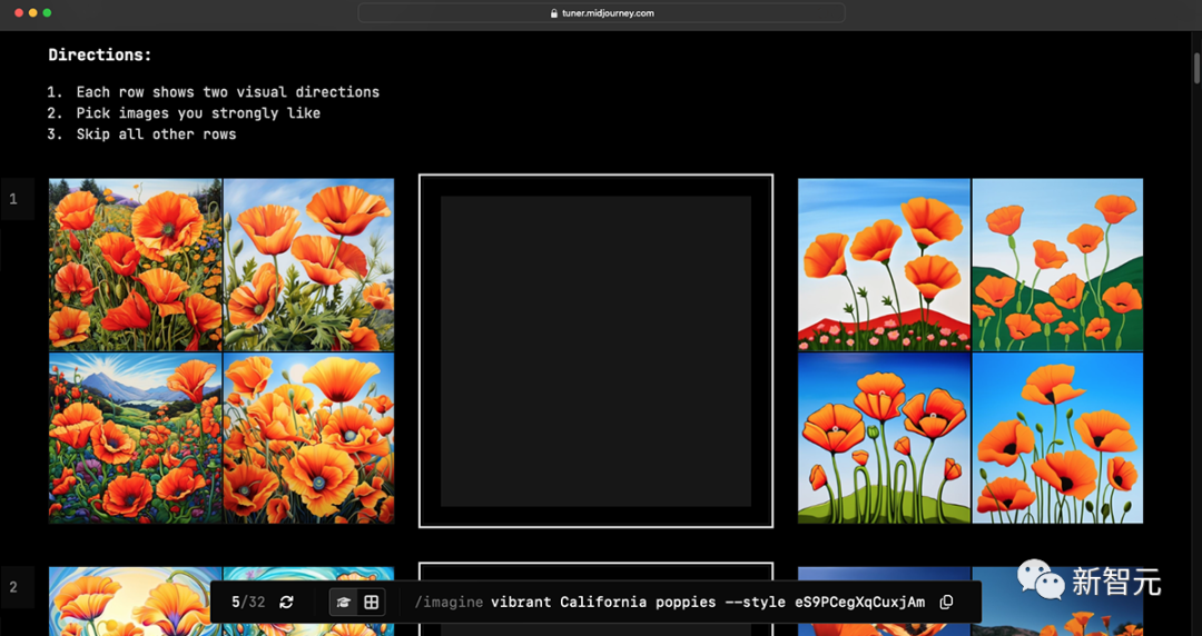 你的「风格调谐器」会以行的形式展示一对对的图像,每对图像代表了针对你提示的不同视觉风格方向。