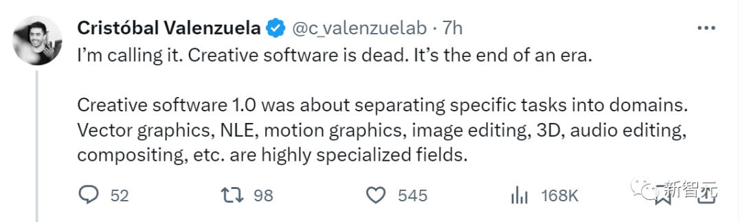 Runway CEO Cristóbal Valenzuela表示,创意软件已死,这是一个时代的终结!