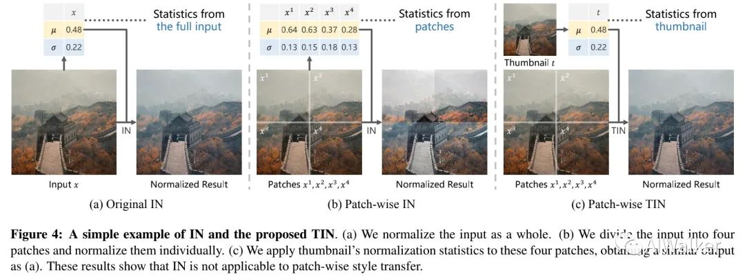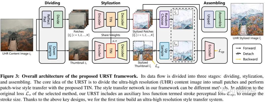 URST通过以下两种策略避免了超高分辨率图像导致的内存问题:(1) 将图像划分成小的图像块进行处理;(2)提出一种新颖的Thumbnail Instance Normalization (TIN)进行块级风格迁移。具体来说,TIN可以提取缩略图的规范化统计信息并应用到小图像块上,确保了不同块之间的风格一致性。