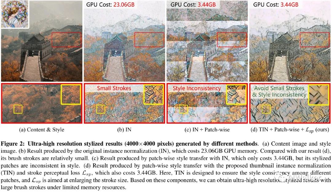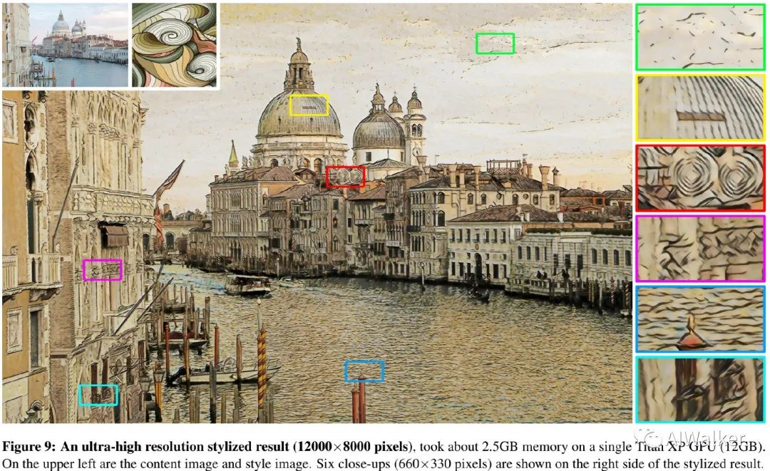 )图像的进行风格迁移的方案。当处理超高分辨率图像时,受限于较大的内存占用与small stroke size问题,现有风格迁移方法往往难以真正应用。