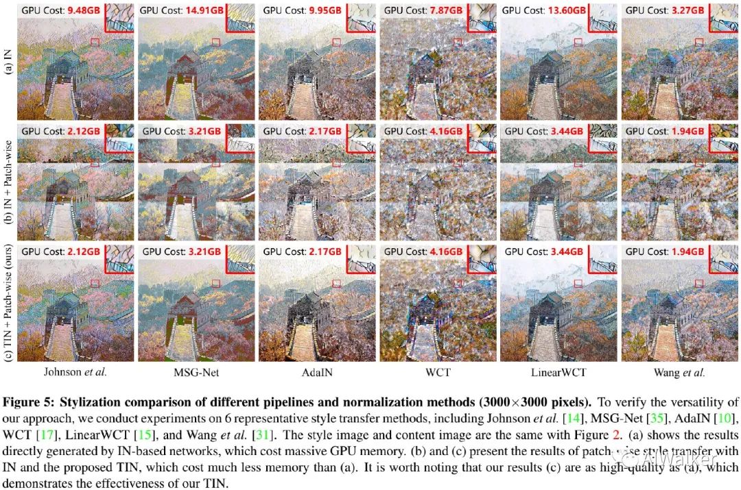 从上图可以看到:(1) IN导致了明显的块间风格不一致问题;(2) 所提方法取得了与全图相似的效果且显存占用更低。