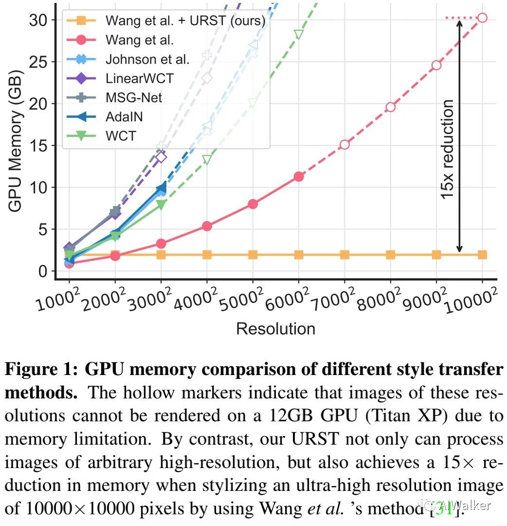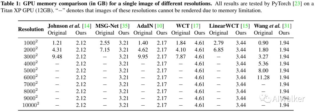 此外,我们还提供了不同风格迁移方案在不同输入分辨率输入时的显存占用对比。可以看到:大多方法甚至不能处理