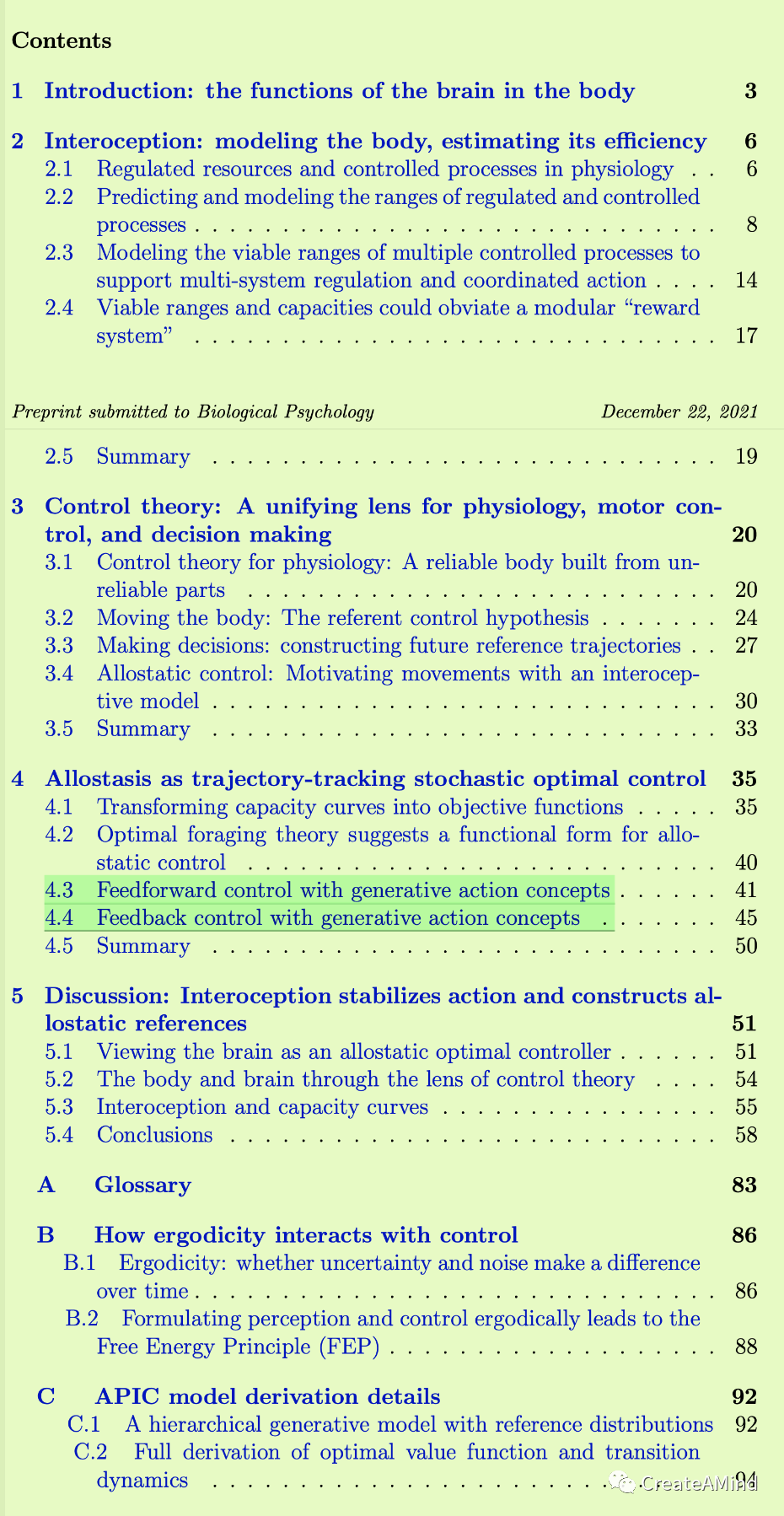 本文的四个部分将内感受与应变稳态联系起来。2章 确定内视知觉如何使大脑能够估计身体在当前时刻的生理效率,这正是它评估和改进行动所需要知道的。3章 然后介绍控制理论并解释它在生理学、运动控制和决策方面的应用;这些提供了概念上的工具来模拟内感受是如何告知allostasis的。4章 应用控制理论的原理来推导一个新颖的形式模型, 说明大脑如何估计生理轨迹的合意性并作出预期的调节决策