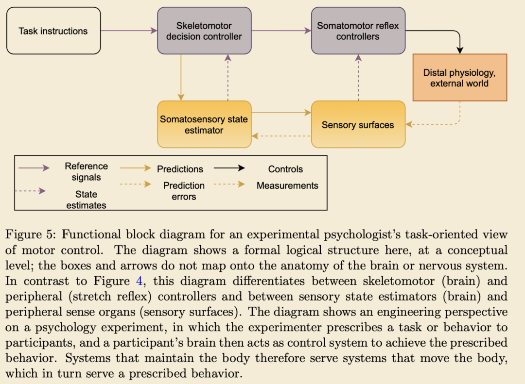 参与骨骼运动控制的皮质区域(例如,初级运动皮质、前运动皮质等。)也向躯体感觉皮层发送向下流动的参考信号的副本(称为传出副本),从而向躯体感觉区域提供先前的预测。这些“先前”信号实际上改变了体感皮层神经元的放电,使它们做好准备,根据即将到来的骨骼运动接收来自世界的信号。这种动态发生在神经系统的所有层次,允许神经系统使用体感预测误差作为反馈来确认或修正运动表现;它还能让神经系统分辨 reafferent (自身原因)来自 exafferent (外部引起的)感觉信号。通过这个镜头,大脑被认为既是控制器(在其内脏运动和骨骼运动功能中)又是相应的状态估计器(在其感知和模拟功能中)。由于在参照控制假设下,骨骼运动“命令”采取下行信号的形式,该下行信号规定了本体感受测量的期望长度和张力,因此在感觉区域的大脑状态估计机器可以模拟那些下行控制信号的躯体感觉结果。