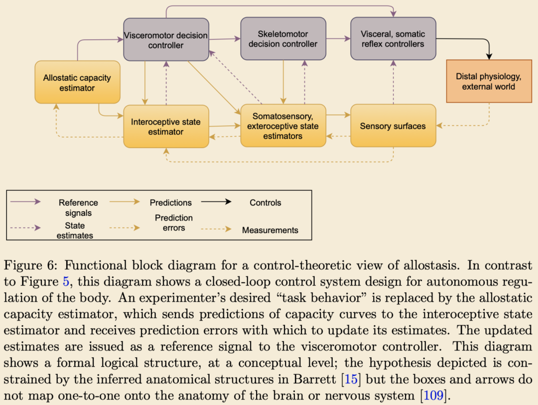 建立和完善基于内脏信号的内部模型的过程本身并不能完成大脑最基本的任务。这项任务是最大限度地提高身体机能的能量效率,以“预测不断变化的需求,评估优先事项,并使机体做好准备,在它们导致错误之前满足它们”(第 4 页,Sterling [21]),这个过程称为 allostasis(关于应变稳态 的进一步讨论,见斯特林和拉夫林[22]、舒尔金和斯特林[23]).并行进化[24]和神经解剖学[19,25,15 有证据表明,外部感受的感觉信号,以及预测这些信号的内部模型,将运动控制置于特定的环境中,并支持运动控制 9].以类似的方式,内脏感觉信号为应变稳态 提供在线反馈,而内感受性内部模型为应变稳态内脏运动控制提供子服务 19,25,26,15].许多证据表明了同样的结论:大脑正在预测性地调节身体,这是一个运动控制的问题,而不是感知世界的问题。这是一个沿着期望的轨迹调节身体以实现效率的问题。
