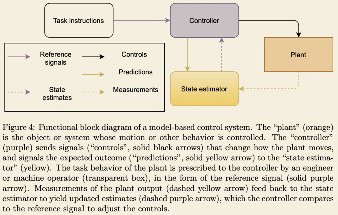 本文的形式模型借鉴了 control theory 这是一门广泛应用于系统生物学和工程学的学科。控制理论处理驱动动力系统沿着(近似)某个期望的轨迹运动,尽管对那些系统的物理干扰可能会使其偏离该轨迹。控制理论也明确了什么是期望的轨迹,该轨迹如何在物理上实现,以及一个系统如何驱动另一个系统遵循更期望的轨迹而不是不太期望的轨迹。本文描述了一种方法,正式建模的机构,保留与以前的经验主义兼容(如 Kleckner 等人[26]、杨等人[41])和理论上的(例如 Pezzulo 等人[42]、科克兰和霍威[43]、Petzschner 等人[28])调查,同时从第一原理建立控制理论