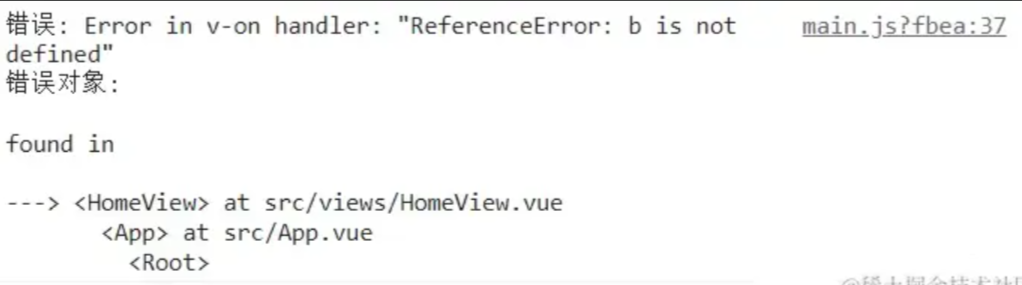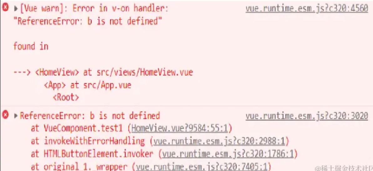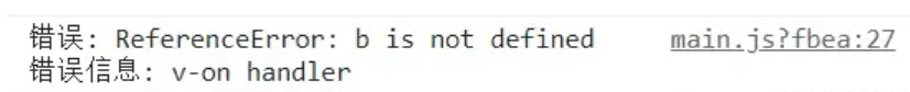 这个错误在控制台也[Vue warn]和常规报错。和上一个错误的区别在于,只有你点击了按钮才会触发函数调用,才会报错。