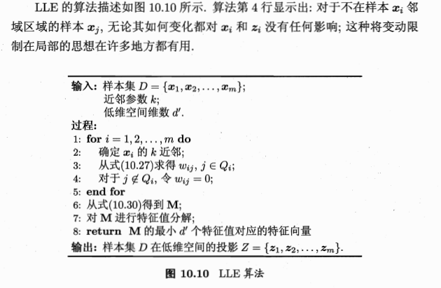 与Isomap试图保持近邻样本之间的距离不同,局部线性嵌入(Locally Linear Embedding, 简称LLE) 试图保持邻域内样本之间的线性关系.如图10.9所示,假定样本点