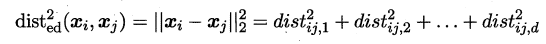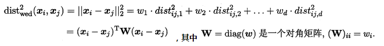 若各个属性重要程度不一样即都有一个权重,则得到加权的平方欧式距离: