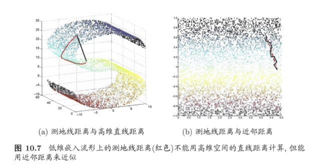如图10.7(a)所示,低维嵌入流形上两点间的距离是“测地线”(geodesic)距离: 想象一只虫子从一点爬到另一点,如果它不能脱离曲面行走,那么图10.7(a)中的红色曲线是距离最短的路径,即S曲面上的测地线,测地线距离是两点之间的本真距离,显然,直接在高维空间中计算直线距离是不恰当的.