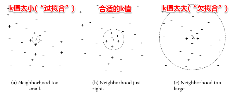 与前面介绍的学习方法相比, k近邻学习有一个明显的不同之处: 它似乎没有显式的训练过程! 事实上,它是“懒情学习” (lazy learning)的著名代表, 此类学习技术在训练阶段仅仅是把样本保存起来,训练时间开销为零, 待收到测试样本后再进行处理(因此朴素贝叶斯也可以懒惰式学习,此类技术在训练阶段开销为零,待收到测试样本后再进行计算。); 相应的,那些在训练阶段就对样本进行学习处理的方法, 称为“急切学习” (eager learning).