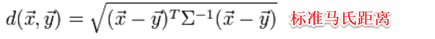 此时各个属性之间都是相互独立无关的,但现实中往往会存在属性之间有关联的情形,例如:身高和体重,一般人越高,体重也会重一些,他们之间存在较大的相关性。这样计算距离就不能分属性单独计算,于是就引入经典的马氏距离(Mahalanobis distance):